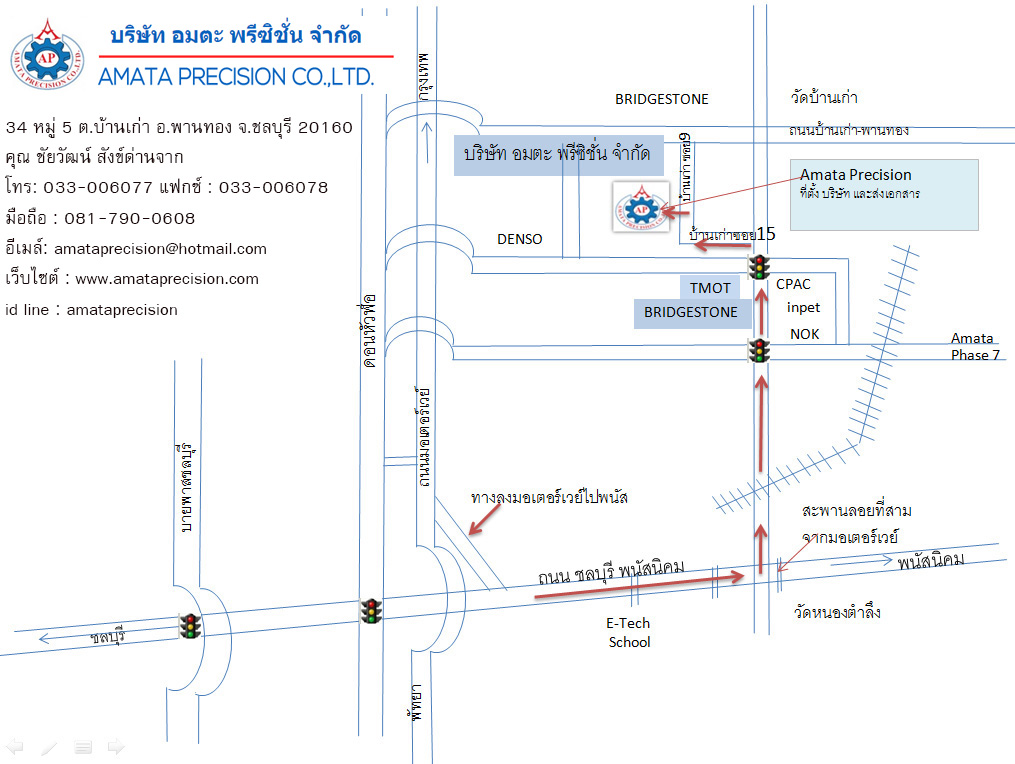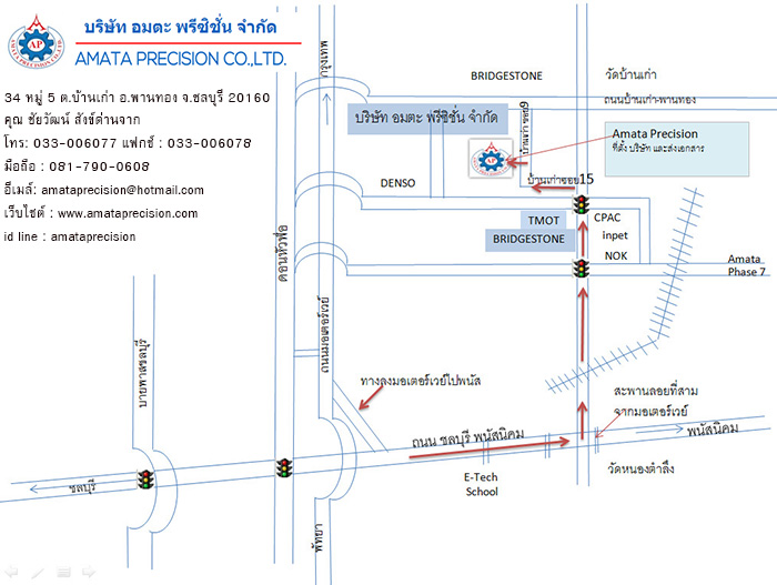 34 หมู่ 5 ต.บ้านเก่า อ.พานทอง จ.ชลบุรี 20160 34 M.5 T. BANKAO A.PANTHONG CHOUBURI 20160 คุณ ชัยวัฒน์ สังข์ด่านจาก Mr. Chaiwat Sangdanjak MOBILE : 081-790-0608 TEL : 033-006077 FAX : 033-006078 E-MAIL ; amataprecision@hotmail.com